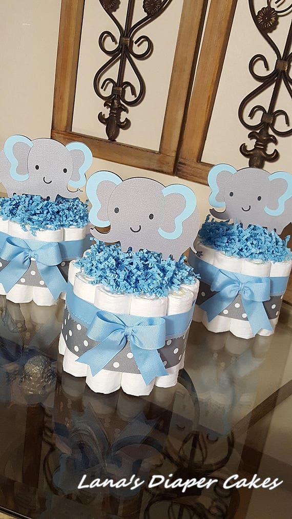 Set Of 3 Blue And Gray Elaphant Mini Diaper Cake Baby Shower Centerpiece Etsy Uk